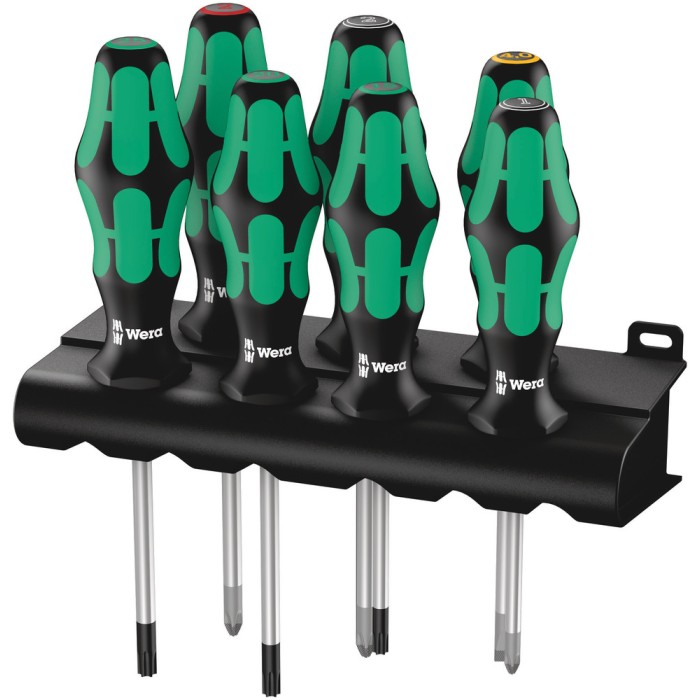 7-delige schroevendraaierset met Kraftform-handgreep om prettig en ergonomisch verantwoord te kunnen werken en blaren en schuurplekken te voorkomen. De Lasertip-punt grijpt zich vast in de schroefkop en voorkomt wegglijden. Med værktøjsfinderen "Take it easy": Farvemarkering efter profiler og størrelsesmærkning. Zeskantige wegrolbescherming verhindert telkens wegrollen op de werkplek. Wordt geleverd met handig rack waarin de schroevendraaiers overzichtelijk kunnen worden opgeborgen.