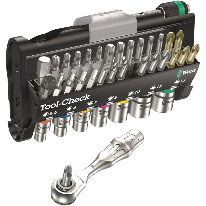 Ratel, bits en doppen op nauwelijks ruimte - compacter kan bijna niet. Inclusief bit-ratel: Eenvoudig te bedienen, zelfs met 1 hand op lastige schroeflocaties. Smeedijzeren uitvoering. Fijnvertand mechaniek (60 tanden) voor een kleine terughaalhoek van 6° voor nauwkeurig werken. Eenvoudige links/rechts-omschakeling. Ergonomisch gevormde ratelkop en -hendel. Voor 1/4" bit- en dopopname. Met Wera adapter 870/1 kunnen ook 1/4"-doppen worden gebruikt. Met extreem harde bits, voor universeel gebruik. Met de hand- en machinesteeksleutel-inzet (ISO 2725-deel 3) van Wera kan zowel handmatig als machinaal worden gewerkt. Voorzien van 'Take it easy'-Toolfinder met kleurcodering op maat - voor het eenvoudig en snel vinden van het benodigde gereedschap. Onder alle omstandigheden grip op het gereedschap, ook met vettige handen. Met kogelvanggroef. Voor buitenzeskant-schroeven en moeren. Gemaakt van matverchroomd chroom-vanadium.