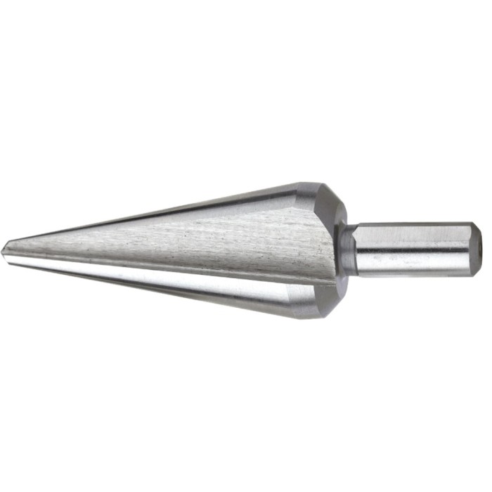 CBN-geslepen plaatboor uit massief HSS. De teruggeslepen conus zorgt ervoor dat bij het doorboren van het materiaal, de boor zonder moeite kan worden teruggetrokken.
