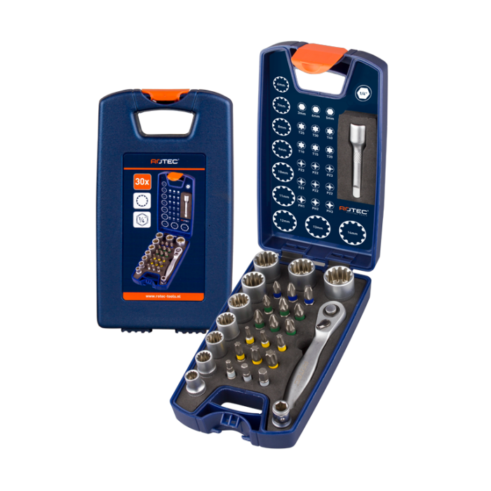 PH (Phillips) : 1x PH 1, PH 2 en PH 3. PZ (Pozi) : 1x PZ 1, 4x PZ 2, 1x PZ 3. T (Torx) : 1x T 10, T 15, T 20, T 25, T 30 en T 40. HEX (Inbus) : 1x 3, 4 en 5mm. Doppen : 1x SW 6, 7, 8, 9, 10, 11, 12, 13 en 14. 1x verlengstuk. 1x adapter. 1x ratelsleutel