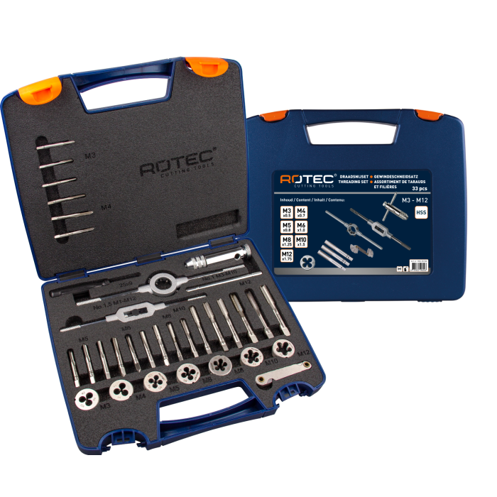 1x tappenset (3-dlg.) M3, M4, M5, M6, M8, M10 en M12 1x snijplaat M3, M4, M5, M6, M8, M10 en M12 1x tapkruk nr.1 1x snijplaathouder 25x9 1x wringijzer nr. 1½ 1x draadmeter (metrisch) 1x schroevendraaier