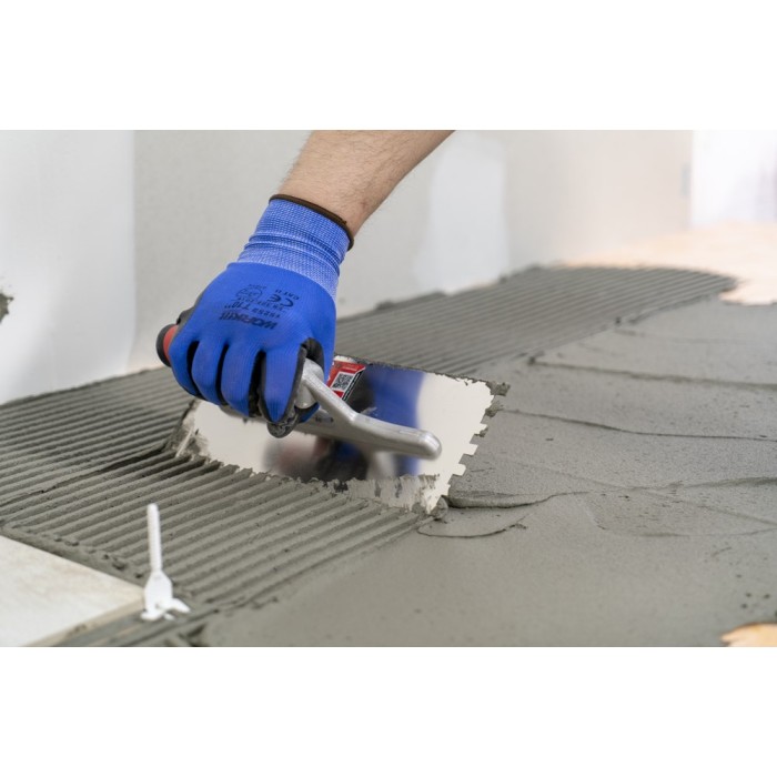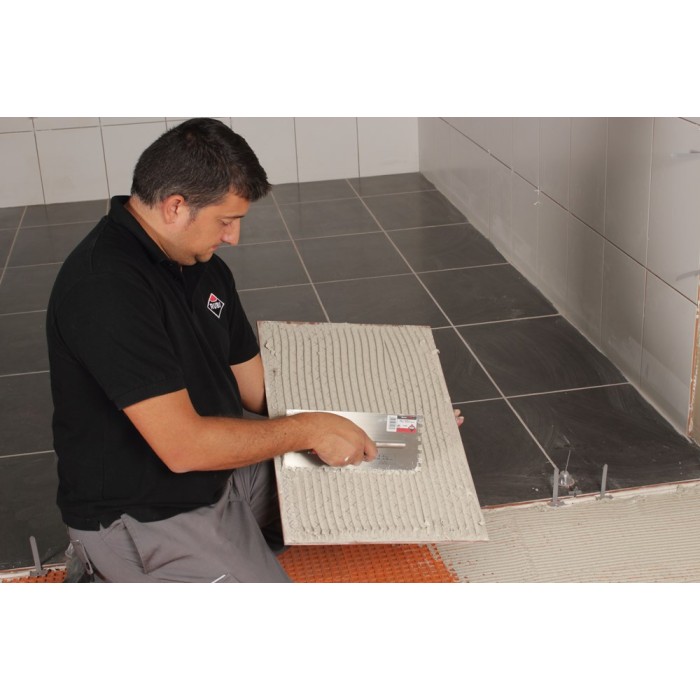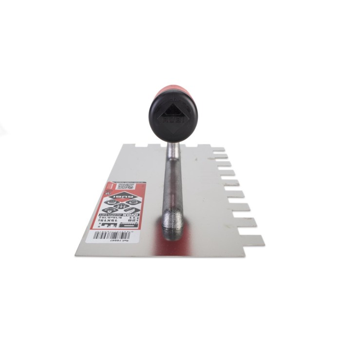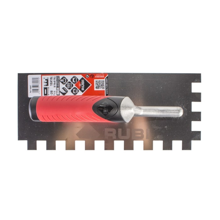 De troffels en gekerfd troffels met open RUBIFLEX handgrepen hebben een extreem lichtgewicht en aluminium versterking.De versterking en de plaat zijn zeer vast bevestigd door middel van drukbouten die eenmaal gemonteerd zijn onmogelijk te verwijderen zonder dat het effect heeft op de unitaire karakter van het gereedschap.De troffels en gekerfd troffels met open RUBIFLEX handgrepen hebben een speciale hoge slijtvaste stalen plaat en corrosiebescherming met kleurloze lak. (STAAL).Er zijn ook modellen met een speciale hoge slijtvaste roestvrij stalen plaat.Een van de kenmerken van alle RUBI troffels en inkeping troffels is de perfecte vlakheid van de plaat.Alle modellen van troffels en gekerfd troffels in deze reeks hebben de exclusieve RUBIFLEX ergonomische handgreep met twee texturen. Een zeer ergonomisch handgreep met een verhoogde grip.Troffel en lijmkam modellen met open handgrepen vergemakkelijken controle bij het aanbrengen van materiaal. Een van de voordelen die professionele tegelzetter vinden aan dit type handgreep, dankzij zijn opening, kan het gereedschap worden opgehangen aan de rand van de bak, kuip of een andere voorwerp waarin het aan te brengen materiaal zit. Hiermeekunt u de troffel of lijmkam ten allen tijde handig en schoon houden.Een ander aspect dat het RUBI assortiment troffels en lijmkammen onderscheid van de rest is het brede scala van modellen en afmetingen van de inkepingen.Bij de toepassing van lijmen voor de montage van keramische tegels, moet er altijd rekening gehouden worden met de open en hardingstijden van elke fabrikant.Daarnaast, als onderdeel van de strategie, wordt bij RUBI continu onderzoek gedaan op basis van de evolutie van de gereedschappen en op basis van de eisen van de door toonaangevende keramische tegel fabrikantenwereldwijd, 30.000 RUBI dealers en meer dan 40.000 eindgebruikers die geregistreerd zijn bij de RUBI club. Als gevolg van al deze factoren, biedt RUBI professionele tegelzetters de meest uitgebreide en geschikt bereik van tools op de markt. Alles wat je nodig hebt voor alle fasen van de verwerking van keramische tegels.