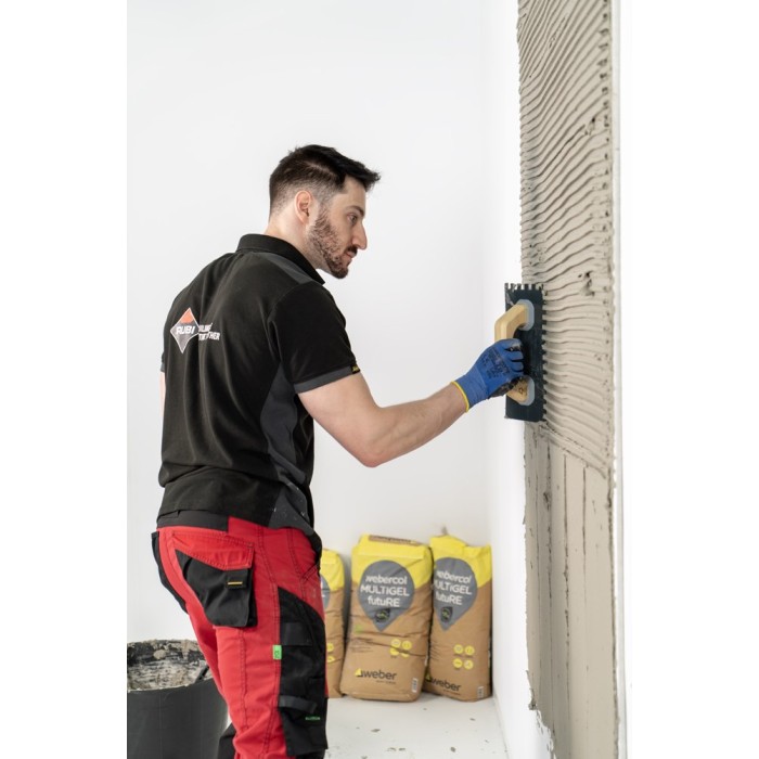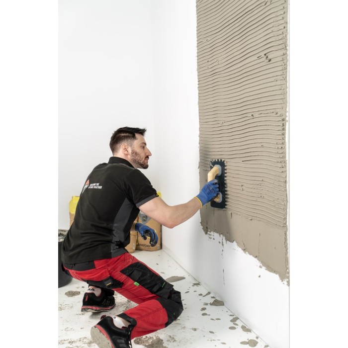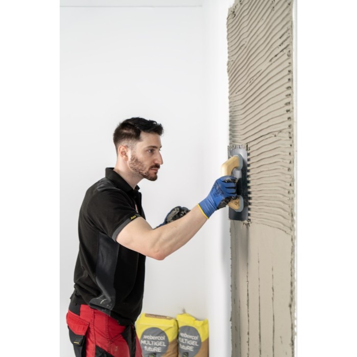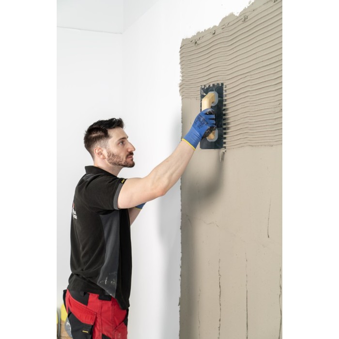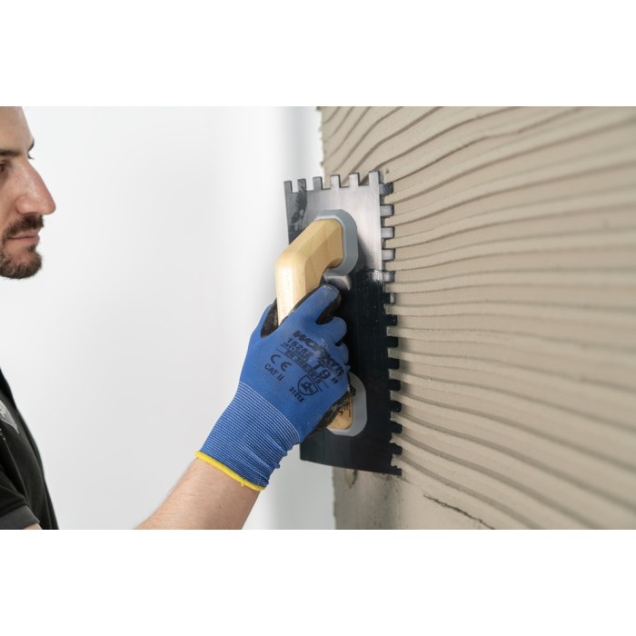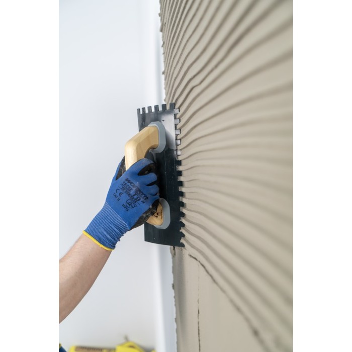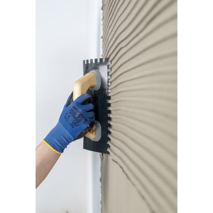 De TECH-FLEX lijmkam met inkepingen is speciaal ontworpen voor gebruik met comforttechnische tlijmen, zoals superlichte en romige types die vaak Flex lijmen worden genoemd.Deze innovatieve lijmkam kan je met elke tegellijm gebruiken en biedt een onge?venaarde prestatie. Dus je kunt hem ook gebruiken met andere lijmen dan alleen flex lijmen. Bovendien hoef je je geen zorgen te maken over slijtage of roest, en zijn er geen scherpe randen. De lijmkam is erg makkelijk schoon te maken. Het geheim zit in het gebogen TECH-FLEX blad, dat gemaakt is van flexibel kunststof. En doordat het blad gebogen is, kun je meer lijm meenemen. Een bijkomend voordeel is dat hij veel stiller is dan een traditionele lijmkam. Hij biedt meer comfort dankzij het lagere gewicht (10% lichter) en minder inspanning bij het aanbrengen van tegellijm.De lijmkam wordt ook aanbevolen bij het aanbrengen van keramische tegellijm op een geotextielmembraan of vloerverwarmingssysteem.