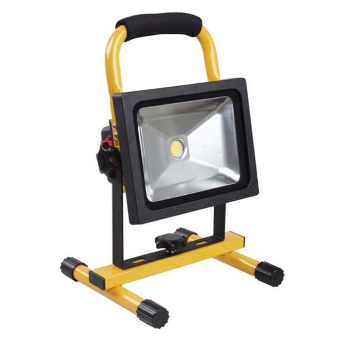 LED accu-bouwlamp voorzien van 1 ultra helle LED lamp 20W, geel/ zwarte aluminium behuizing, gemonteerd op voet met softgrip handgreep. Lamp is kantelbaar. Led indicatie groen (vol) en rood (laden). Wanneer de accu bijna leeg is gaat led indicatielampje knipperen. De bouwlamp schakelt zichzelf uit.