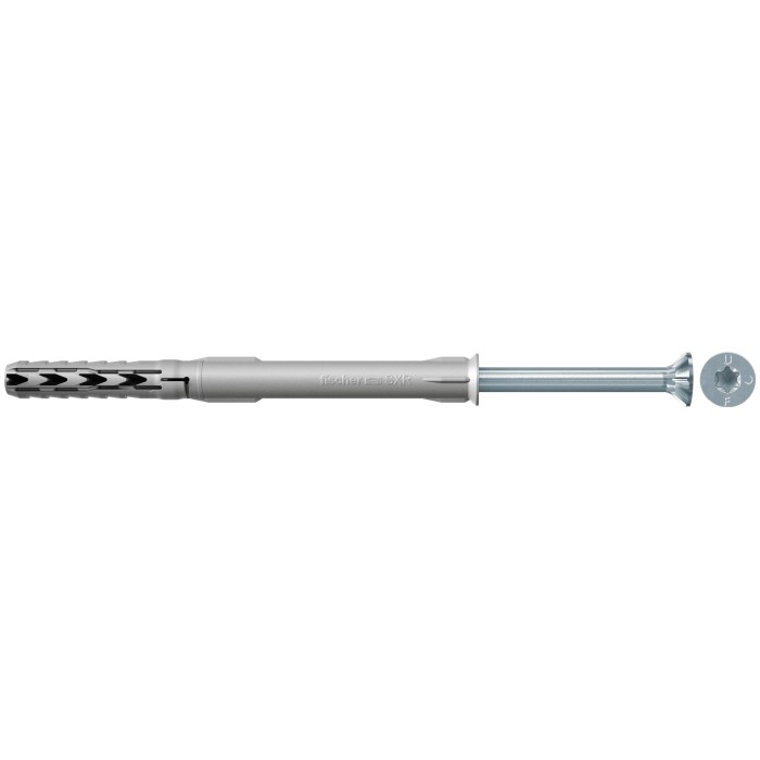 De fischer Constructieplug SXR-T is een plug van kwalitatief hoogwaardig nylon met voorgemonteerde fischer borgschroef met verzonken kop. Dankzij de bijzondere geometrie van de plug kan de SXR in massief materiaal en materialen zoals geperforeerde baksteen worden gebruikt. Door de geringe verankeringsdiepte van slechts 50 mm kan de constructieplug in het bijzonder bij meervoudige bevestigingen van niet-dragende systemen op zeer efficiënte wijze worden verwerkt. De fischer Constructieplug SXR-T is door de schroef met verzonken kop bijzonder geschikt voor de bevestiging van houtconstructies.
