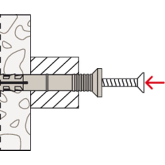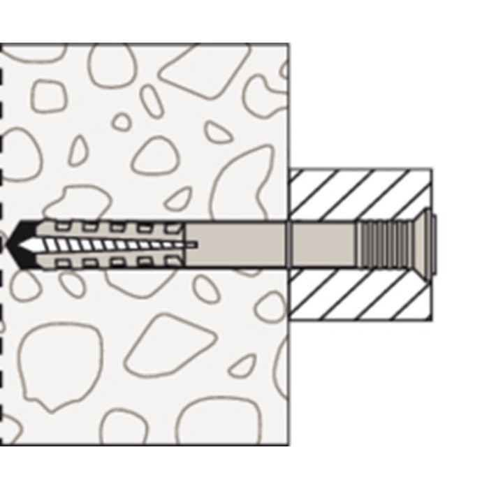 De fischer Nagelplug N-S met verzonken kop bestaat uit een plug van kwalitatief hoogwaardig nylon en een gegalvaniseerde nagelschroef. Deze zijn voor een snelle montage reeds vooraf gemonteerd. De nagelplug wordt in de tijdbesparende doorsteekmontage door het montagestuk gevoerd. Bij het intikken van de nagelschroef spreidt de huls open en verankert in het materiaal. De fischer Nagelplug N-S met verzonken kop is ideaal voor de bevestiging van houtconstructies in allerlei bouwmaterialen in de interieurbouw.